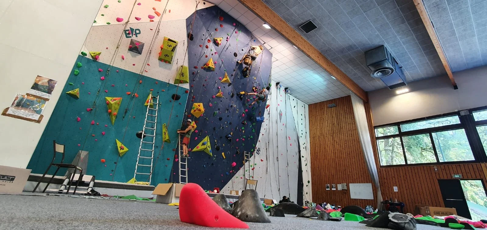 Nos 3 coachs Julien / Luc / Martial, accompagnés de quelques jeunes du club, ont totalement démonté les prises du mur du Fayet pour pouvoir les nettoyer et proposer un toute nouvelle configuration.
